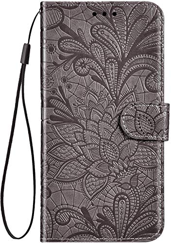 Ysimee beschermhoes voor Huawei Y5 2019/Honor 8S, bloemenmotief uit kant, leer grijs.
