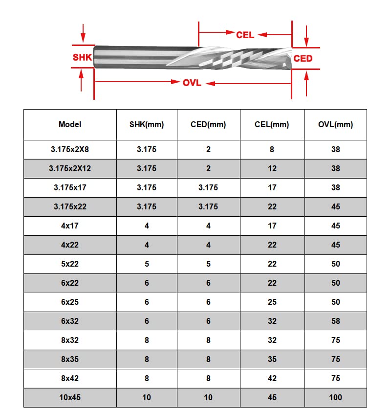 Specification: MOOCO MORNING 10 st 4x22mm 17mm Links Spiraal down cut twee dubbele Fluiten houtbewerking MDF Multiplex router bit CNC einde molen carbide hout frees